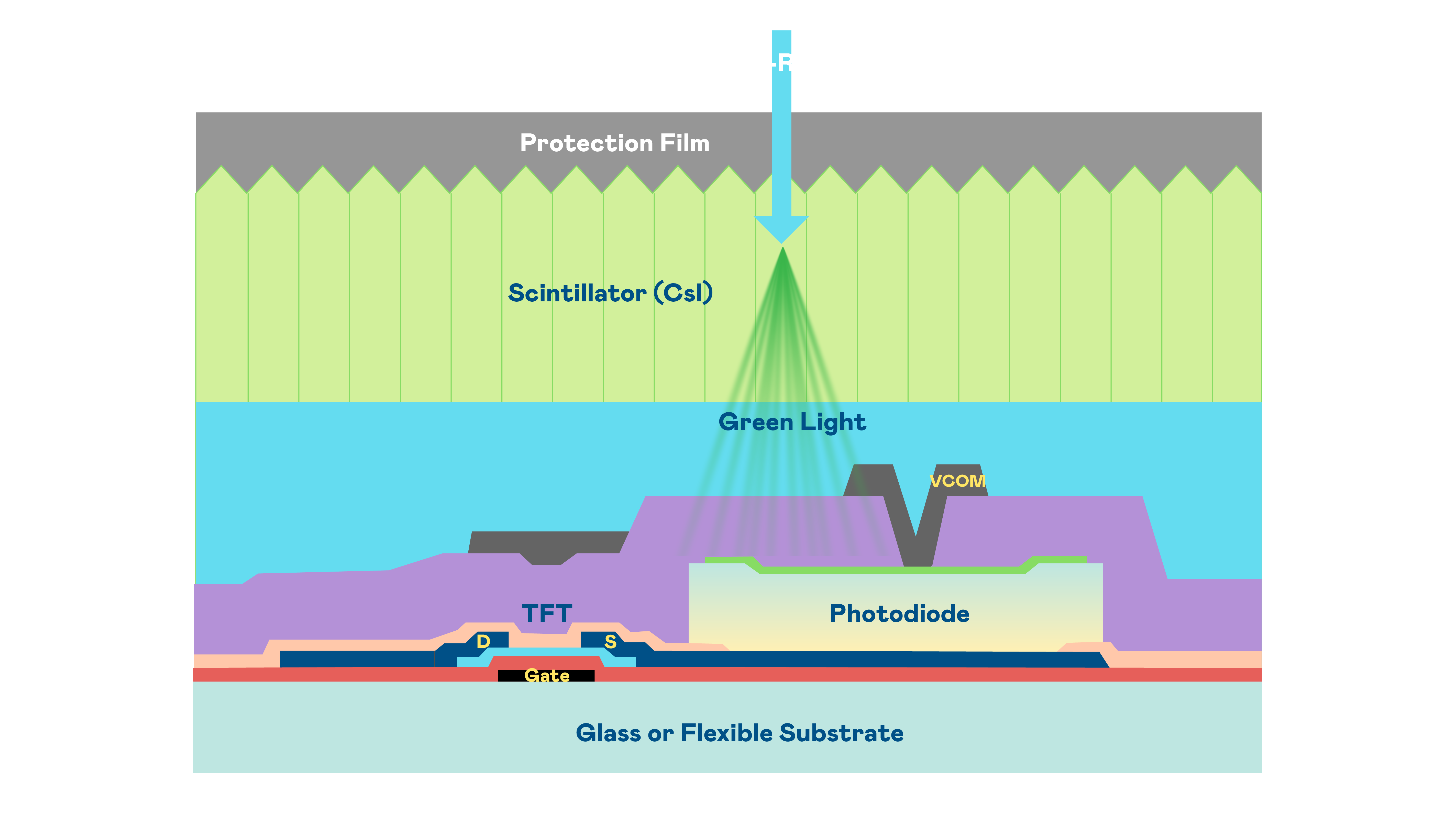 pp电子的X光影像感测阵列使用薄膜电晶体 (TFT) 作为每个像素的读取开关,搭配光电二极体(Photodiode)的光电转换元件,用以感测X光影像讯号。